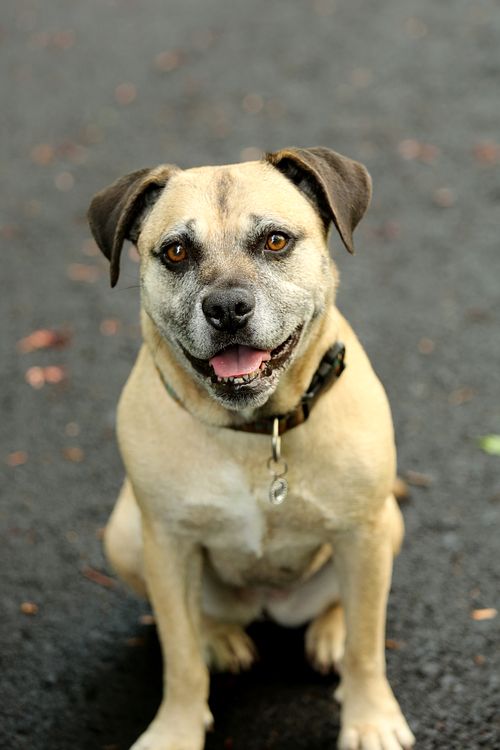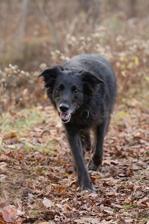 An older shepherd mix and rescue dog is looking relaxed at the camera in golden Fall light